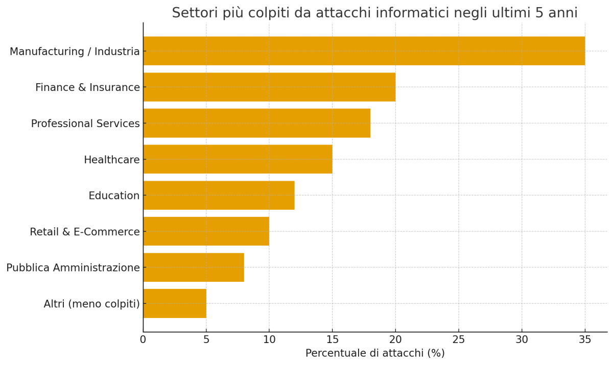 Gli attacchi informatici non hanno solo conseguenze tecniche: possono generare danni economici significativi e colpire settori in modo differenziato. Ecco alcune stime indicative e la distribuzione percentuale degli attacchi negli ultimi anni.